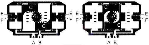 壓縮(suo)空氣從氣口(B)進(jìn)入氣缸兩活塞(sāi)(C)之間中腔時,使(shǐ)兩活塞分離向(xiang)氣缸兩端方向(xiàng)移動,兩端氣腔(qiang)的空氣通過氣(qi)口(A)排🏃♂️出,同時使(shǐ)兩活塞(C)的齒條(tiáo)同步帶動🌈輸出(chu)軸(D)(齒輪)逆時針(zhēn)方向旋轉✊90度。可(ke)以從兩端調整(zheng)微量角度,松動(dòng)螺母🈲(E)用内六角(jiǎo)扳手擰動調節(jiē)螺栓(F)調整所需(xū)角度,鎖緊螺母(mǔ)(E)。反之壓縮空氣(qì)則從氣口(A)進入(rù)氣缸兩端氣腔(qiāng)時,使兩活塞向(xiàng)氣缸中間方向(xiàng)👅移動,中間氣腔(qiang)的空氣通過氣(qi)口(B)排☔出,同時使(shǐ)兩活🈲塞(C)的齒條(tiáo)同步帶動輸出(chu)軸(D)(齒輪)順時🔴針(zhēn)🏃🏻方向旋轉90度。