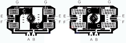 壓縮空氣從(cong)氣口(B)進入氣缸(gang)兩活塞(C)之間中(zhong)腔時,使兩🧡活塞(sai)分離向氣缸兩(liǎng)端方向移動,迫(po)使兩端的彈簧(huáng)壓💯縮,兩端氣腔(qiāng)的空氣💛通過氣(qi)口(A)排出,同時使(shǐ)兩活塞(C)的齒條(tiao)同步帶動輸出(chu)軸⭐(D)(齒輪)逆時針(zhēn)方向旋轉90度。在(zài)壓縮空經過電(diàn)磁閥換向後,氣(qì)缸的兩活塞在(zai)彈簧的彈力下(xia)向中間方向移(yi)動,中間氣腔的(de)空✉️氣從氣口(B)排(pái)出,同時使兩活(huo)塞(C)的齒條同步(bù)帶🛀動輸出軸(D)(齒(chǐ)輪)順時針⭐方向(xiàng)旋轉90度。可以從(cóng)兩端調整微㊙️量(liàng)角度,松動螺母(mu)(E)用✊内六角扳手(shou)擰動💜調節螺栓(shuan)(F)調整所需角度(dù),鎖緊螺母(E)。