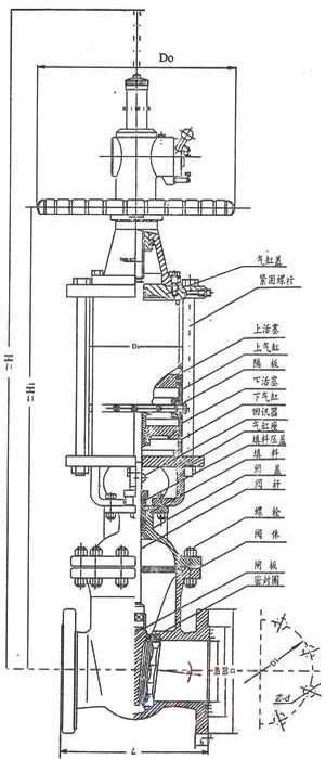 1、本閥(fá)主要由閥體(tǐ)、閥蓋、閘闆、閥(fá)杆、密封圈、雙(shuang)層氣缸及其(qi)活塞、活塞杆(gǎn)、隔闆連同緩(huan)沖機構、手動(dong)機構、氣動-手動轉換(huàn)裝置和閥蓋(gài)填料裝置等(deng)部分組成。